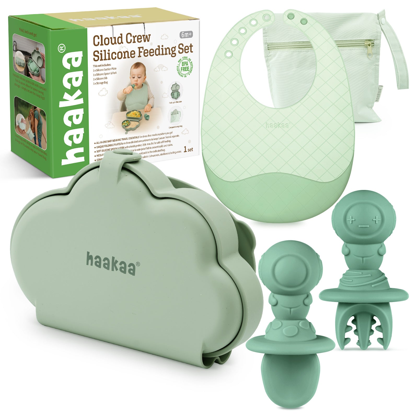 This set includes a foldable suction plate, bib, fork, spoon and waterproof storage bag with carry strap.