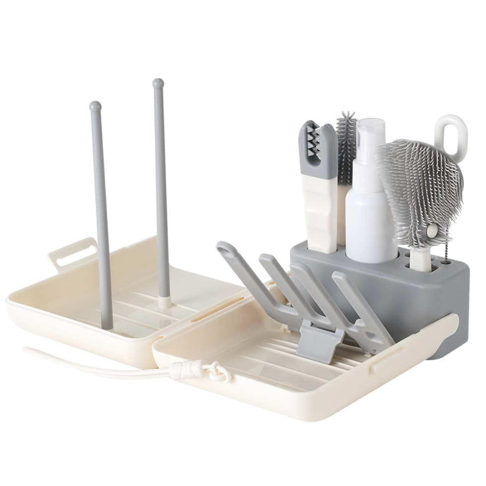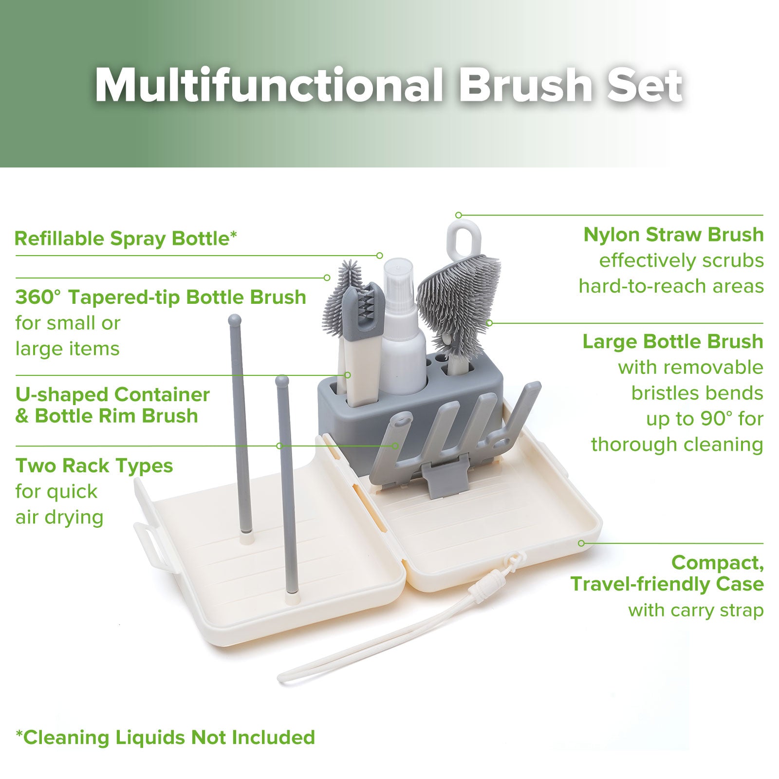 For finer tasks, the nylon straw brush reaches into narrow spots and tight corners, and the dual-direction U-shaped brush fits snugly to the rims of cups or bottles without scratching. Two types of adjustable drying rack allow for effective, efficient air-drying after cleaning. There's even a refillable spray bottle to dispense your chosen cleaning liquids. When you're done, everything folds neatly into the compact, travel-ready case complete with a carry strap for grab-and-go convenience.