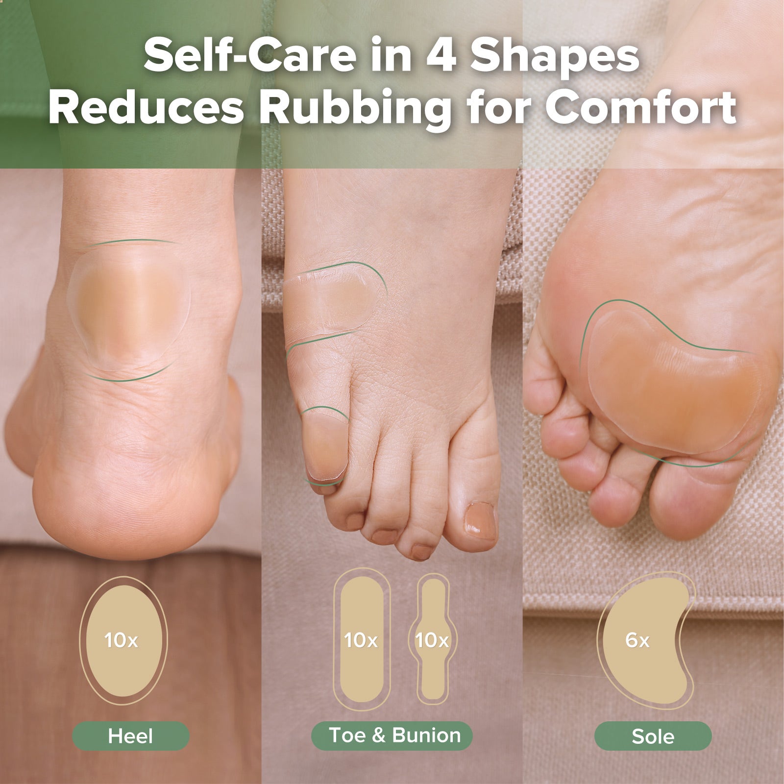 Protect your feet from blisters, rubbing, and pressure with our ultra-thin Gel Blister Pads! Each pad forms a soft, discreet barrier that cushions sensitive areas and reduces friction from shoes and movement. The water-resistant and highly adhesive design keeps the pads securely in place, even when exposed to sweat, light moisture, and daily wear, while remaining invisible in your shoes! Gentle on skin, they peel off cleanly with no residue, making removal a breeze. Perfect for everyday use, travel, or even to protect the skin on your feet due to pregnancy-related swelling, this set includes individually wrapped pads in four shapes to fit toes, heels, and any other areas you want to protect, whether at home or on the go!