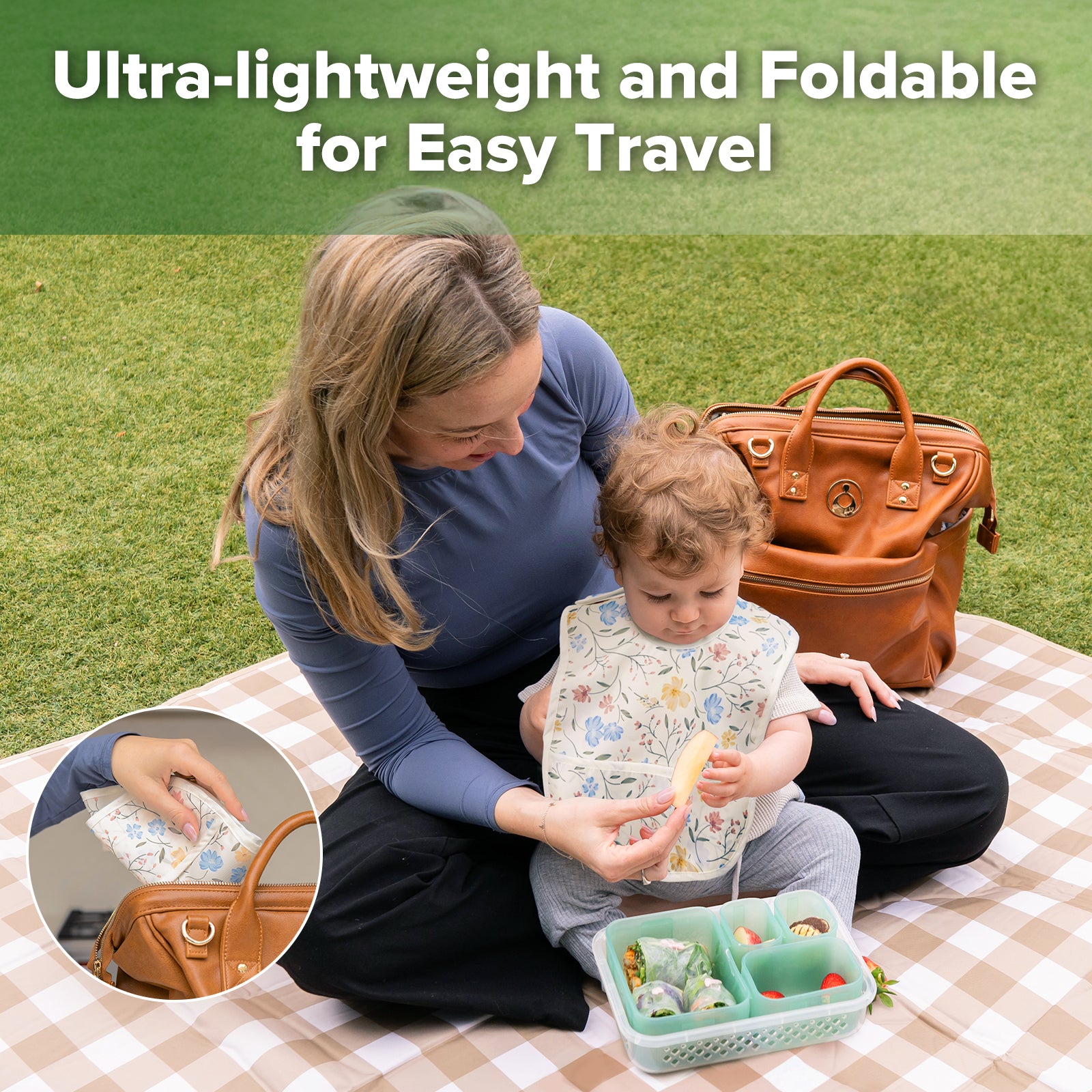 Adult supervision is required at all times. Check product condition regularly. Replace this product if it shows any signs of damage. Never use this product to cover your baby's head or face. Do not expose to open flames or sharp objects. Do not forcefully stretch this product. Do not use this product for anything other than its intended use. Ensure this product is clean before use. Avoid prolonged soaking or storing in damp environments to prevent unpleasant odours. Although this product is water-resistant, large splashes should be wiped off promptly. Change to a clean bib if needed to avoid staining or seepage.