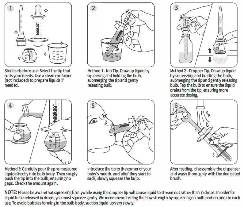 Before first use, disassemble and clean the product and then place the silicone components in boiling water for 5 minutes. This is to ensure hygiene. Wash before and after each use. Always sterilise after any illness. Although dishwasher safe, we recommend hand washing with the cleaning brush in warm soapy water, then rinsing and drying thoroughly. To sterilise the dispensers & storage box, use a steam steriliser or boil in water for 2-3 minutes. Brush NOT suitable for microwaves, sterilisers or boiling water due to stainless steel components. Do not use any bleach-based cleaners or tablets to clean or sterilise your Haakaa products. Silicone may absorb the colours of liquids it comes in contact with. To minimise discolouring, wash immediately after use. Store product in a cool, dry place and avoid direct sunlight.